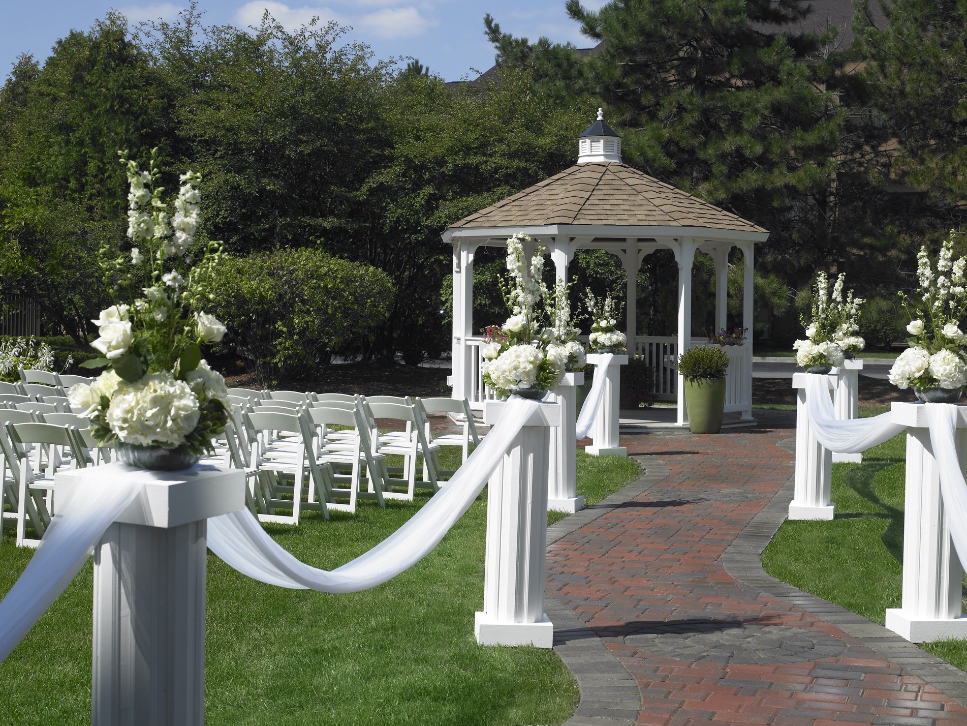 Eat, drink and be married in our elegant Grand Ballroom which seats up to 200 guests. Our Outdoor Gazebo provides a lush and charming backdrop for your wedding ceremony. No matter your preferences, we will take care of everything from the menu to the linens to the coordination of your vendors so that you can take care of the memories.